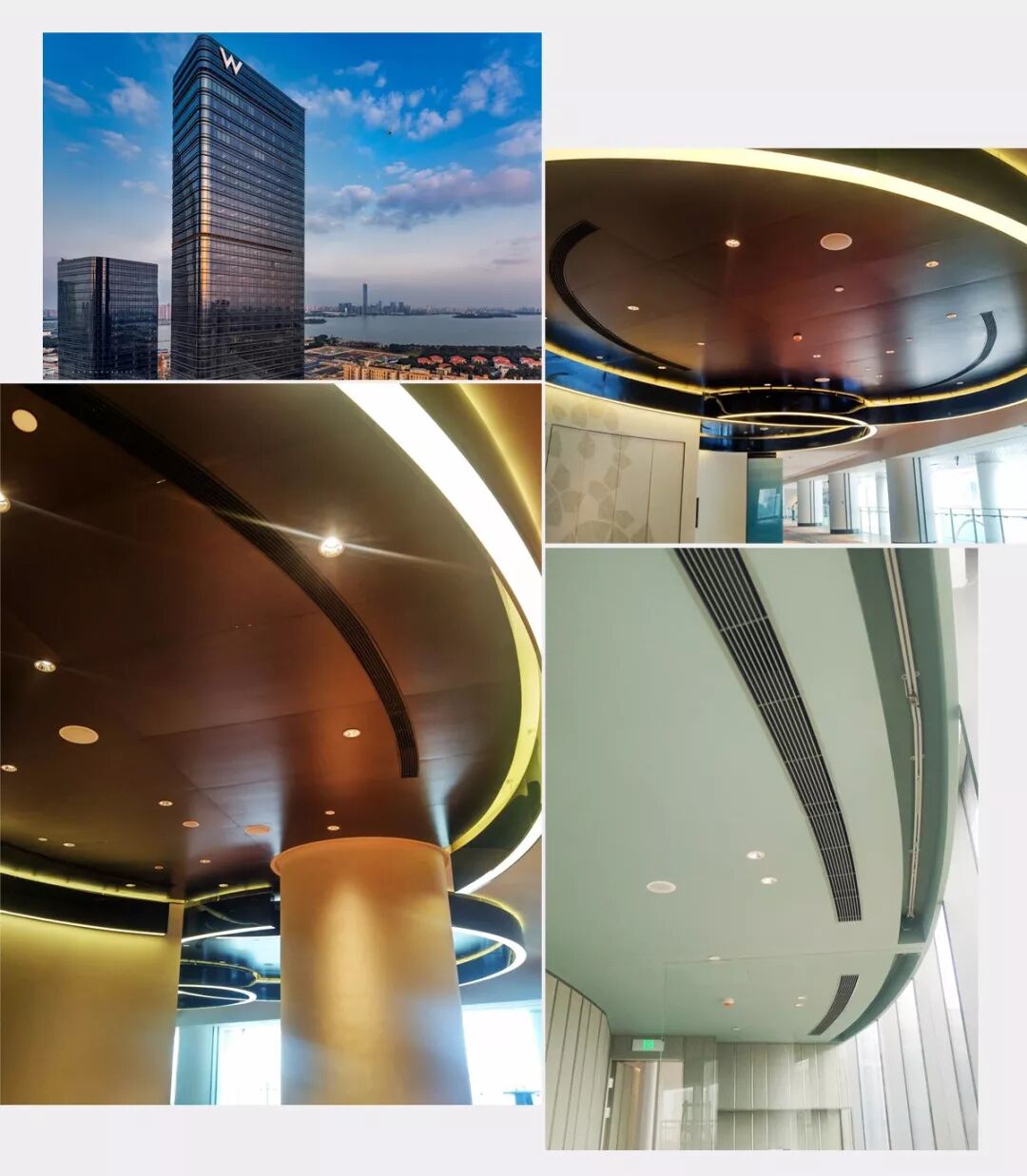 2017年,全球现代奢华时尚生活品牌W酒店落户在了苏州园区,为这座城市再添一张充满活力的名片。酒店设计极具特色,运用很多弧形和曲线来表达东方审美中的“圆融”理念,创建空调为W酒店量身定制了所有风口产品,弧形风口优美舒张,条形风口简约流畅,还有与环境融于一体的球形喷口、圆盘风口等,美观实用。